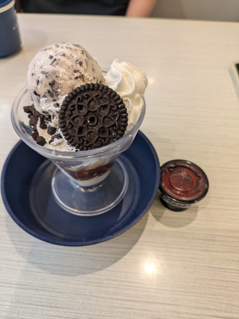 アイスやクッキー、チョコ、ベリーが重なった層構造になっていて、最後まで飽きずに楽しめます。