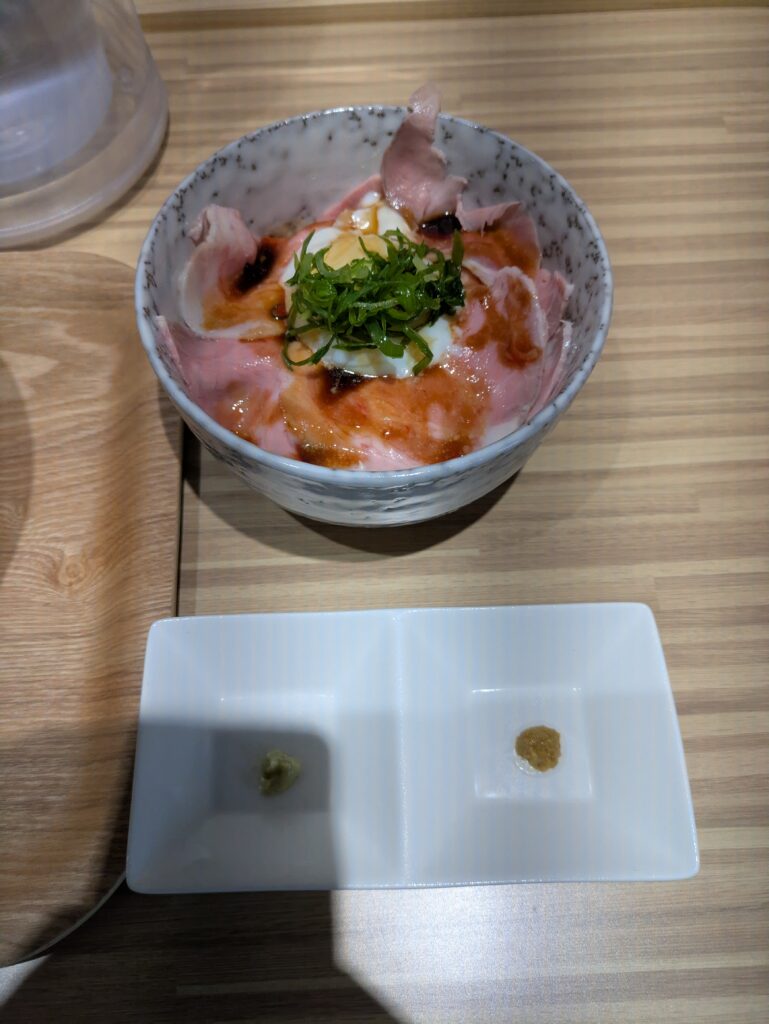 ご飯にはチャーシューの旨味がしっかり染み込み、満足度の高い仕上がり。2種類のワサビが添えられており、味の引き締め役として抜群の相性です。