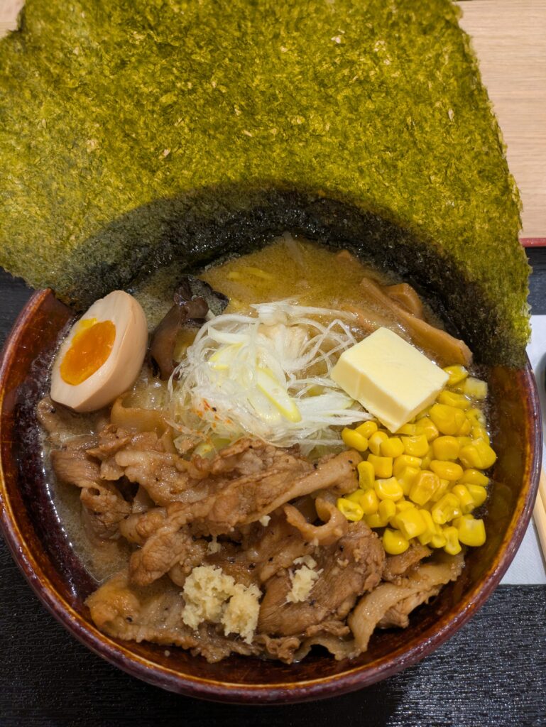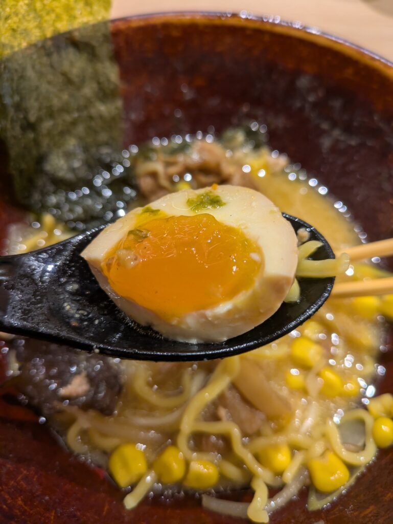 麺は中太のちぢれ麺で、スープとの絡みも抜群。もやし・ねぎ・コーンなどの具材が加わり、食べ進めるごとに味と食感の変化が楽しめます。
